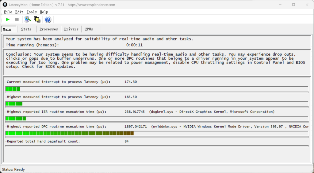尝试过intPolicy修改USB的驱动工作核心,用LatencyMon查看高ISR和DCP,结果都指向nvlddmkm.sysWdf01000.sys